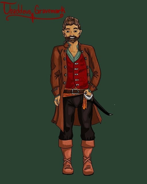 Thaddeus “Grave” Gravemarke is a half-elf swashbuckler with a silver tongue, a quick blade, and a shadowed past he keeps well-guarded behind a smirk. Known across dockside taverns and skyship ports alike, Thaddeus moves through the world with practiced charm and a glint of mischief in his eye—never too far from trouble, yet always managing to land on his feet.
